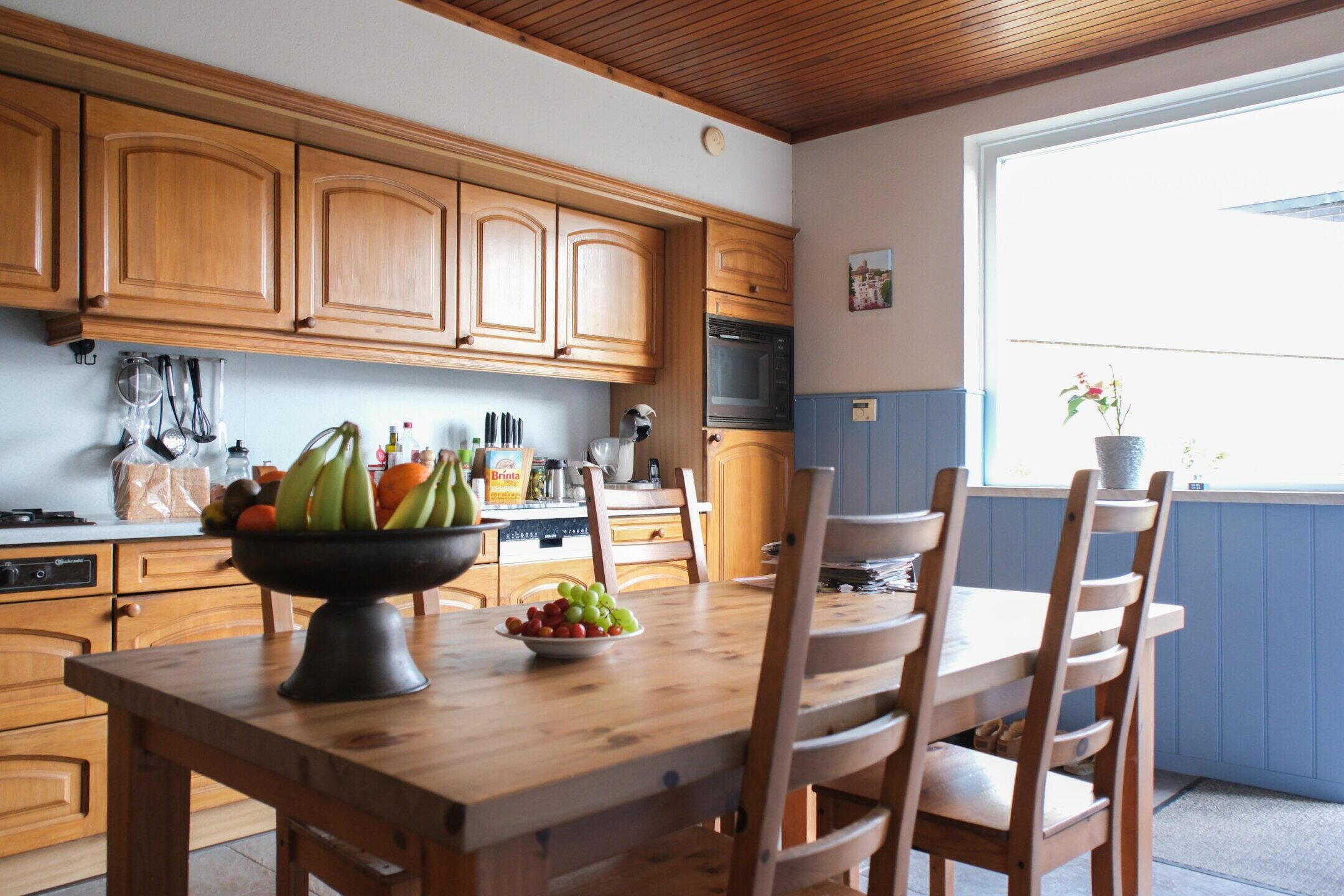 De woon-/eetkeuken is uitgevoerd in een rechte opstelling en beschikt over diverse inbouwapparatuur, waaronder een gaskookplaat, afzuigkap, spoelbak, vaatwasser (45 cm), combimagnetron en koelkast. In de keuken ligt een tegelvloer met vloerverwarming, wat zorgt voor extra comfort.